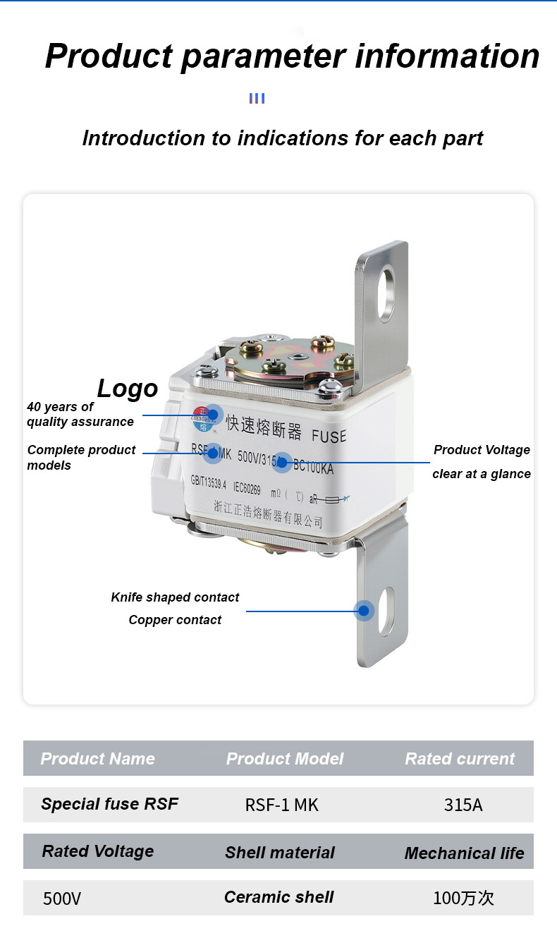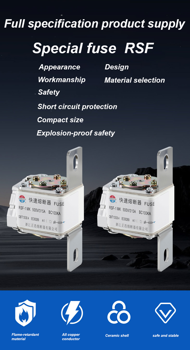 RSF-1MK 500V-315A BC100KA Fuse Links হল একটি উচ্চ-ক্ষমতাসম্পন্ন শিল্প সার্কিট ব্রেকার যা উচ্চ-শক্তি বৈদ্যুতিক সুরক্ষা পরিস্থিতির জন্য উপযুক্ত। RSF-1K 500V-315A BC100KA ফিউজ লিঙ্ক