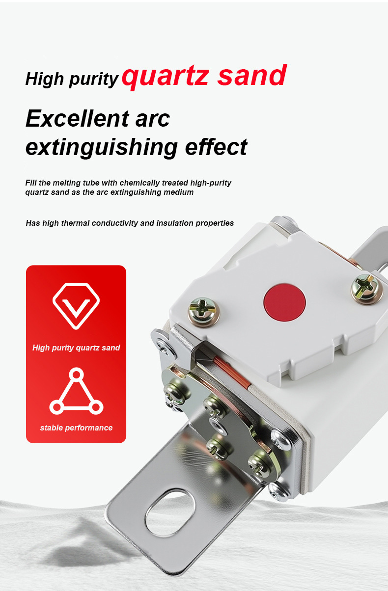 500V এর একটি রেটেড ভোল্টেজ এবং 315A এর একটি রেটযুক্ত বর্তমান রয়েছে, যা কার্যকরভাবে বৈদ্যুতিক নিরাপত্তা নিশ্চিত করতে পারে, ওভারলোড এবং শর্ট সার্কিট প্রতিরোধ করতে পারে। RSF-1K 500V-315A BC100KA ফিউজ লিঙ্ক