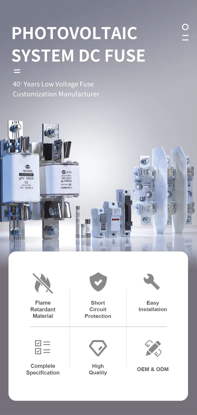 জেডএইচপিভি -125 1000V ডিসি ফিউজ বেসের 22 × 58 ফটোভোলটাইক ফিউজ বেসটি সাধারণত 22 মিমি × 58 মিমি মূল আকারের সৌর সিস্টেমে ব্যবহৃত সরঞ্জামগুলিতে ফটোভোলটাইক ফিউজ ইনস্টল করতে ব্যবহৃত হয়। জেডএইচপিভি -125 1000V ডিসি ফিউজ বেস স্ট্যান্ডার্ড ফটোভোলটাইক ফিউজগুলির জন্য উপযুক্ত এবং সাধারণত উচ্চ-তাপমাত্রা প্রতিরোধী উপকরণ দিয়ে তৈরি হয়, যা উচ্চ-তাপমাত্রার পরিবেশে কাজের অবস্থার প্রতিরোধ করতে পারে। এটি বাইরের পরিবেশে দীর্ঘমেয়াদী স্থিতিশীল অপারেশন নিশ্চিত করে ভাল আবহাওয়া প্রতিরোধ এবং জারা প্রতিরোধের ভাল।